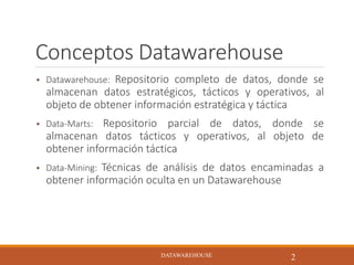 Un datawarehouse es un repositorio de datos estratégicos, tácticos y operativos que permite obtener información estratégica y táctica. Los data-marts son repositorios parciales de datos para obtener información táctica. El data-mining usa técnicas de análisis para descubrir información oculta. Un datawarehouse almacena datos actuales e históricos del negocio de manera estable y resumida para propósitos de análisis.