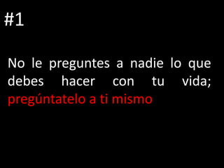 El documento ofrece consejos para vivir una buena vida. Recomienda no preguntarle a otros sobre tus decisiones de vida y en cambio escuchar a tu propia voz interior. Es importante establecer prioridades y pensar cuidadosamente sobre lo que realmente quieres, a pesar de que algunos deseos puedan ser contradictorios. El mensaje principal es que debes hacer lo que quieras y vivir la vida que deseas.