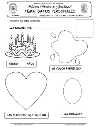 El documento pide a un estudiante de 3 años que proporcione sus datos personales, incluyendo su nombre, edad, color preferido y una huella digital. El estudiante debe completar esta información como parte de una actividad escolar en su clase de nivel inicial.