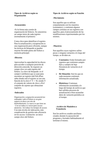 Este documento describe las características básicas de las bases de datos, incluyendo los tipos de archivos según su organización y función, los campos y campos clave, y los principales sistemas de gestión de bases de datos como Oracle, Microsoft SQL Server, Microsoft Access y PHPMyAdmin.