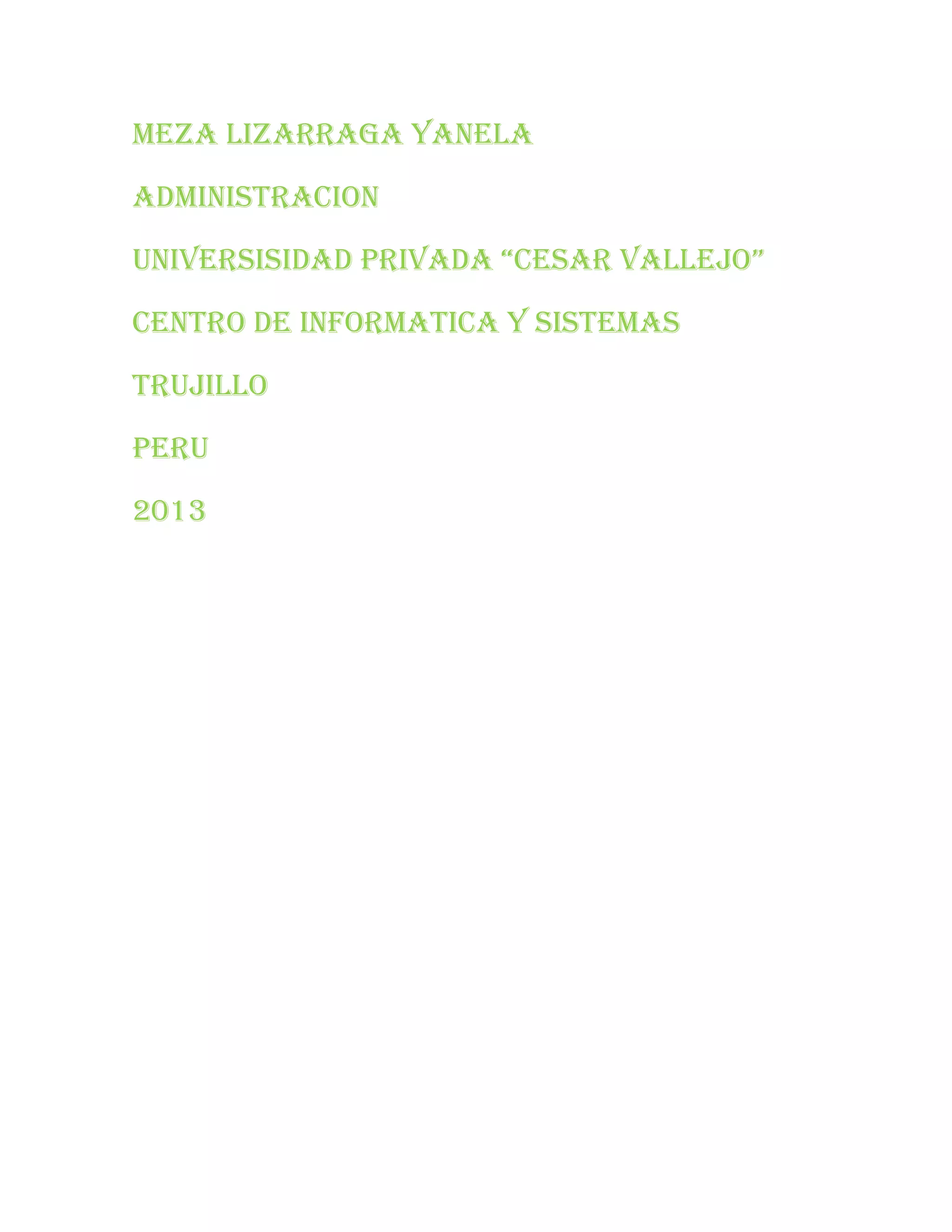 La estudiante Yanela Meza Lizarraga está estudiando Administración en la Universidad Privada "Cesar Vallejo" en Trujillo, Perú. Se graduó en el Centro de Informática y Sistemas en el año 2013.