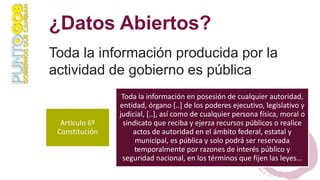La constitución mexicana establece que toda la información producida por el gobierno es pública y solo puede reservarse temporalmente por razones de seguridad nacional. Los datos abiertos gubernamentales deben ser accesibles digitalmente en formatos abiertos y no discriminatorios para promover la transparencia democrática y permitir que la ciudadanía genere conocimiento e innovación a partir de datos recopilados con fondos públicos. Generar uso de los datos a través de hackatones u otras estrategias puede justificar la inversión gubernamental en su a