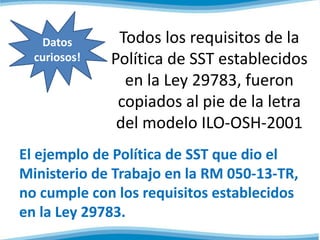 El documento describe varias modificaciones propuestas a la Ley 29783 de Seguridad y Salud en el Trabajo de Perú. Se propone eliminar a la Confiep como representante de los empleadores en dos consejos y reemplazarla por gremios más inclusivos. También se presentó al Congreso un proyecto de ley en abril de 2014 para modificar algunos artículos de la ley original.