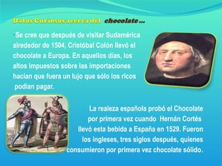 El chocolate fue llevado a Europa por Cristóbal Colón después de visitar Sudamérica en 1504, pero sólo los ricos podían pagarlo debido a los altos impuestos. La realeza española lo probó por primera vez en 1529 cuando Hernán Cortés lo llevó a España. Napoleón y otros personajes históricos como Goethe y Hitler disfrutaban del chocolate por su capacidad para aumentar la energía.