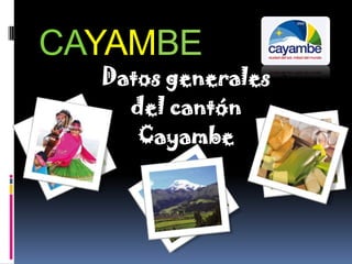 El documento proporciona información general sobre el cantón de Cayambe, Ecuador. Ubicado a 78 km de Quito, Cayambe tiene una extensión de 1350 km2 y una población de aproximadamente 70,000 habitantes. Está dividido en cinco parroquias rurales y tres urbanas. La bandera de Cayambe consiste en dos franjas verdes separadas por una franja amarilla con el escudo en el centro, el cual presenta seis castillos de plata sobre un fondo verde y amarillo.
