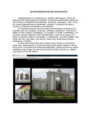 El documento proporciona información sobre Ahuachapán, El Salvador. Se ubica a 100 km de San Salvador y limita con varios municipios y Guatemala. Se divide en 28 cantones y su clima varía de cálido en el norte a fresco en el sur. Tiene una rica historia y celebra varias festividades importantes como las fiestas patronales de 5-14 de febrero y el Día de los Farolitos el 7 de septiembre.