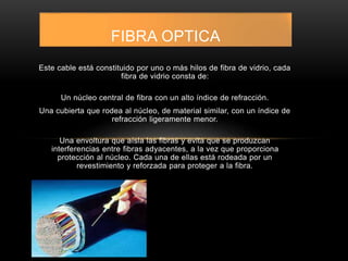 Este documento describe las características de la fibra óptica. La fibra óptica consiste en un núcleo de vidrio con un alto índice de refracción rodeado por una cubierta de vidrio con un índice ligeramente menor. La luz viaja a través del núcleo debido a la reflexión en la cubierta. La fibra óptica proporciona una transmisión de datos de alta velocidad, gran ancho de banda, largo alcance y seguridad.