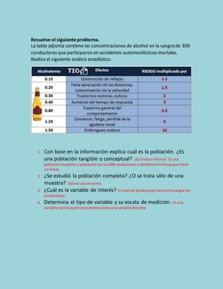 El documento presenta los resultados de un análisis estadístico de los niveles de alcohol en la sangre de 300 conductores involucrados en accidentes mortales. La variable de interés es el nivel de alcohol en la sangre, medida como una variable continua pero tratada como discreta. Se elabora una tabla de frecuencias que muestra la distribución de los niveles de alcohol. Adicionalmente, se calculan medidas de tendencia central y dispersión, y se grafican los resultados.