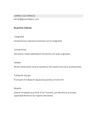 Giovanet SAC es una escuela de capacitación profesional en Perú que ofrece servicios de consultoría, asesoría y capacitación a través de un equipo multidisciplinario. Su misión es brindar servicios de capacitación para mejorar el conocimiento de sus clientes y lograr su desarrollo laboral, mientras que su visión es convertirse en una empresa líder de capacitación a nivel nacional comprometida con el desarrollo del capital humano. La escuela invita a profesionales de instituciones y empresas a capacitarse con