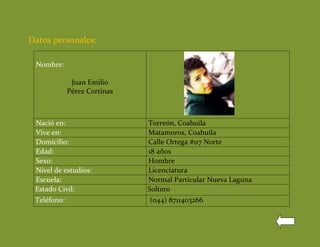 Juan Emilio Pérez Cortinas es un estudiante de 18 años de edad de Torreón, Coahuila que cursa la licenciatura en la Normal Particular Nueva Laguna. Sus gustos incluyen ver la televisión, estar en Facebook, leer y ver películas con amigos, mientras que sus aficiones son ver series dramáticas y hacer escándalo durante los partidos de fútbol. Espera que el curso le enseñe más herramientas avanzadas de Microsoft Word para utilizar el programa al 100% en su vida diaria y laboral.
