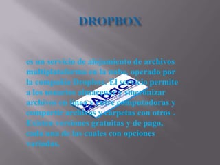 Dropbox es un servicio de almacenamiento en la nube que permite a los usuarios sincronizar y compartir archivos entre dispositivos de forma gratuita o paga. Los usuarios pueden almacenar archivos en una carpeta especial y acceder a ellos desde cualquier lugar, y también compartir archivos con otros. Dropbox usa cifrado para proteger los datos y ofrece funciones como historial de versiones y recuperación de archivos borrados.