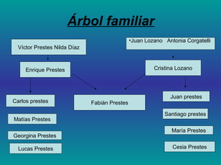 El documento presenta la información personal de Fabián Prestes, incluyendo sus estudios, correo electrónico y un árbol genealógico con sus padres, hermanos y sobrinos. También menciona que actualmente no tiene intereses particulares pero le gustaría irse lejos de su ciudad, y que dentro de 10 años se ve viviendo en su propia casa, con un trabajo que disfrute y en un barrio sin tanta gente chismosa.