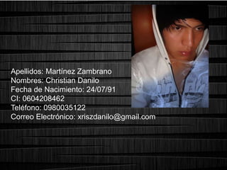 Este documento presenta la información personal de Christian Danilo Martínez Zambrano, incluyendo su fecha de nacimiento, número de cédula, teléfono y correo electrónico. También menciona que es de la comunidad de Gatazo en el cantón Colta, y que sus pasatiempos favoritos son hacer deporte, hacer música con su banda cristiana. Sus aspiraciones para este semestre son aprender, aplicar lo aprendido en su vida y obtener las mejores calificaciones posibles para continuar con sus estudios.