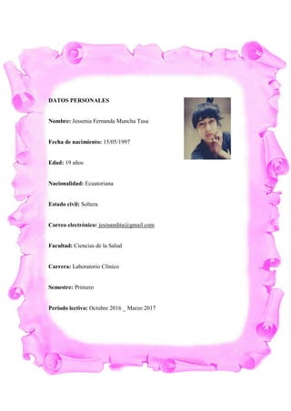 Jessenia Fernanda Muncha Tusa es una estudiante ecuatoriana de 19 años nacida el 15 de mayo de 1997. Actualmente cursa el primer semestre de la carrera de Laboratorio Clínico en la Facultad de Ciencias de la Salud durante el periodo lectivo de octubre de 2016 a marzo de 2017.