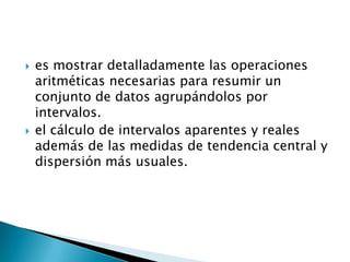 El documento presenta un enfoque detallado sobre la organización y el análisis de datos mediante tablas estadísticas, incluyendo el cálculo de intervalos aparentes y reales, así como medidas de tendencia central y dispersión. Se ejemplifica el proceso de agrupamiento de datos en intervalos y la obtención de intervalos reales a partir de intervalos aparentes. Además, se menciona la creación de tablas que contienen frecuencias y otras métricas estadísticas necesarias para el análisis de datos.