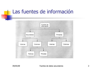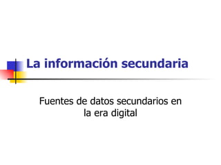 El documento habla sobre las fuentes secundarias de datos en la era digital. Explica que los datos secundarios son datos previamente recopilados que pueden usarse para identificar problemas, formular diseños de investigación y proporcionar información comparativa. También describe varios tipos de datos secundarios internos y externos, como informes de la compañía, datos del gobierno y estudios de mercado privados. Además, menciona algunos usos comunes de los datos secundarios como el análisis del comportamiento del mercado y la construcción de mode