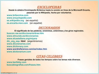 El documento lista numerosas fuentes en línea confiables como enciclopedias, diccionarios, sitios sobre medicina, tecnología y biografías que ofrecen información actualizada de forma gratuita para confirmar datos o resolver dudas de manera rápida y sencilla sin necesidad de visitar múltiples sitios.