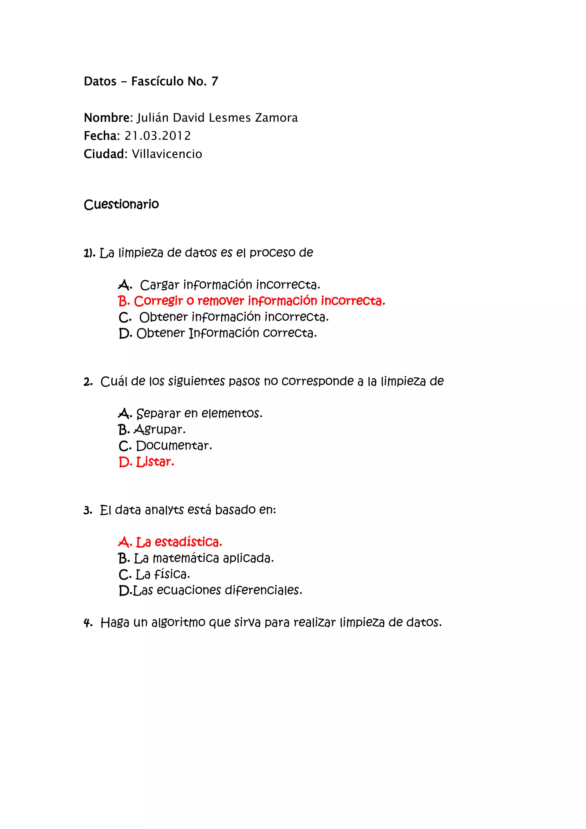 El documento presenta un cuestionario de 4 preguntas sobre conceptos relacionados con la limpieza de datos. La primera pregunta trata sobre la definición de limpieza de datos y las opciones de respuesta. La segunda pregunta identifica cual de los pasos no corresponde a la limpieza de datos. La tercera pregunta indaga sobre las bases del análisis de datos. La cuarta pregunta solicita desarrollar un algoritmo para la limpieza de datos.