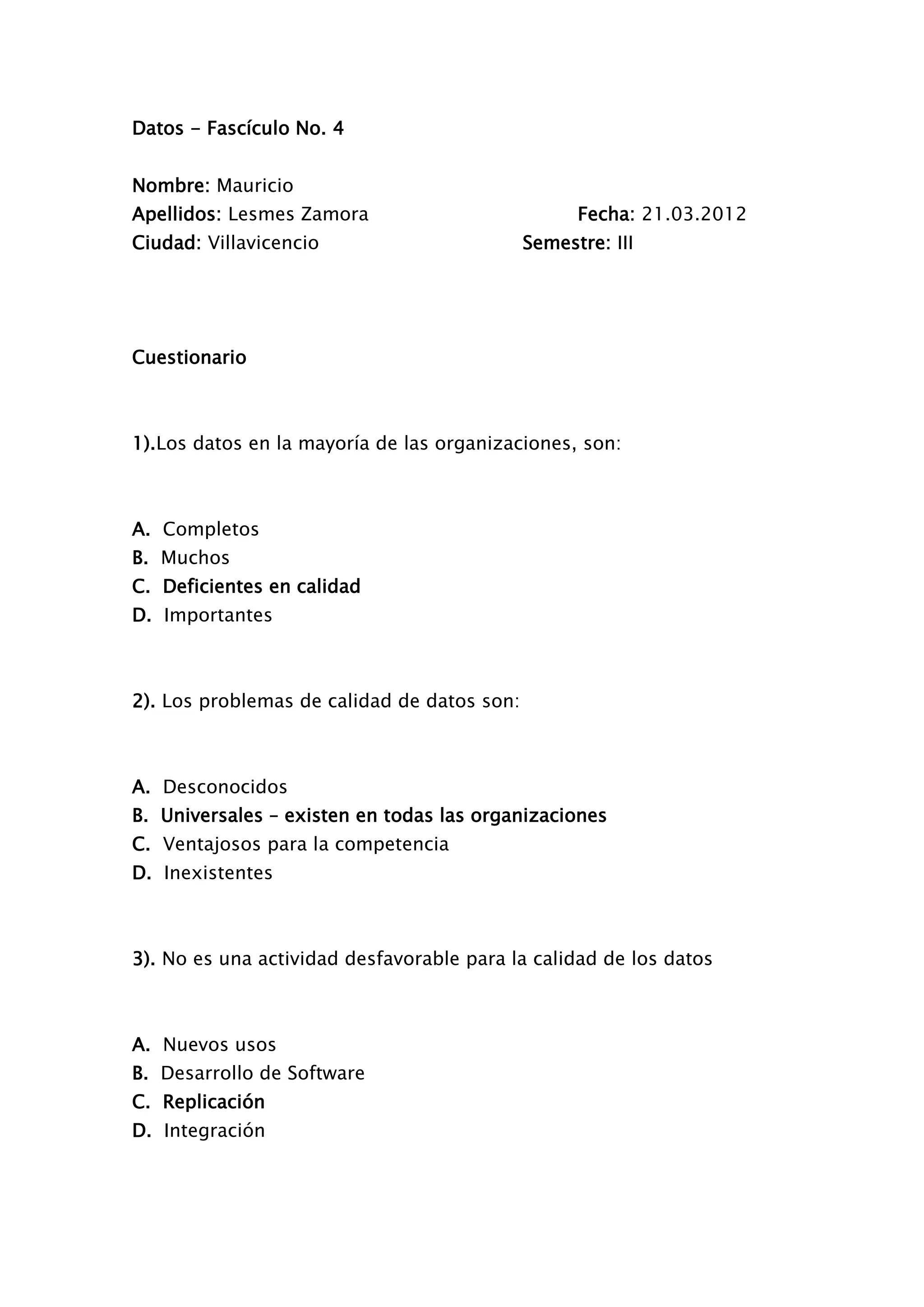 Este documento contiene un cuestionario de 4 preguntas sobre calidad de datos. El cuestionario fue completado por Mauricio Lesmes Zamora como parte de su tercer semestre de estudios en la ciudad de Villavicencio. El cuestionario explora temas como los problemas comunes de calidad de datos, actividades que no afectan negativamente la calidad y procesos que no impactan la calidad.