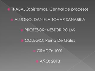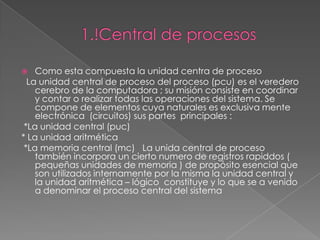 Este documento describe los componentes principales de una unidad central de procesamiento (CPU), incluyendo la unidad central, la unidad aritmética, la memoria central y los registros rápidos. También describe periféricos de entrada y salida como teclados, monitores e impresoras. Explica las generaciones de computadoras desde 1940 hasta la actualidad y componentes como la tarjeta madre, memoria RAM, disco duro, tarjeta de sonido y tarjeta de red.