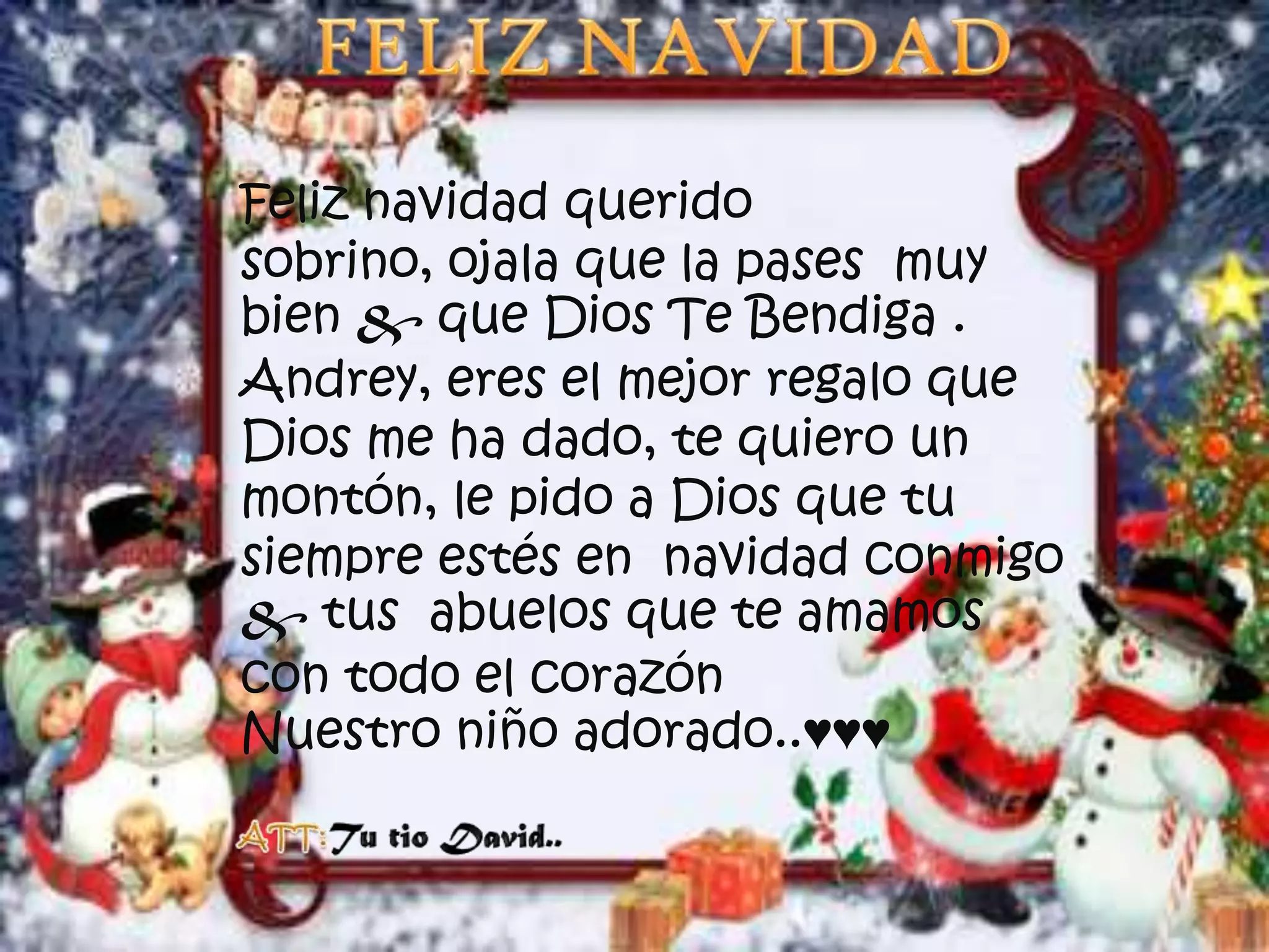 Un tío desea un feliz día de Navidad a su sobrino Andrey, expresando que es el mejor regalo que Dios le ha dado y que reza para que siempre pase las Navidades con él y sus abuelos, quienes lo aman con todo el corazón.