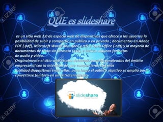 SlideShare es una plataforma para compartir presentaciones en línea que ofrece tanto ventajas como desventajas para los usuarios. Entre sus ventajas se encuentra la posibilidad de compartir contenidos de forma gratuita y global, pero también conlleva desventajas como problemas de privacidad y dificultad para controlar el uso no autorizado de los materiales compartidos.