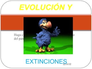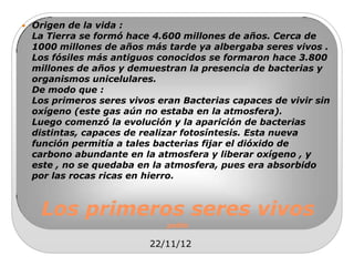Este documento describe las principales etapas de la evolución de la vida en la Tierra y las grandes extinciones que han ocurrido. Comienza con la aparición de las primeras bacterias hace aproximadamente 3800 millones de años y describe la evolución hacia organismos eucariotas, pluricelulares y la colonización de la tierra. También resume tres de las mayores extinciones masivas, ocurridas al final de los períodos Cámbrico-Ordovícico, Ordovícico-Silúrico y Silúrico-