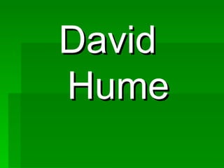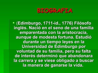 David Hume fue un filósofo escocés del siglo XVIII conocido por sus contribuciones al empirismo y el escepticismo filosófico. Estudió leyes pero lo abandonó para dedicarse a la escritura y ocupó varios cargos como bibliotecario y secretario. Sus obras más importantes cuestionaron la metafísica y la teología tradicionales y argumentaron que el conocimiento se basa únicamente en la experiencia. También realizó importantes contribuciones a la historia y la teoría económica que influyeron en pens