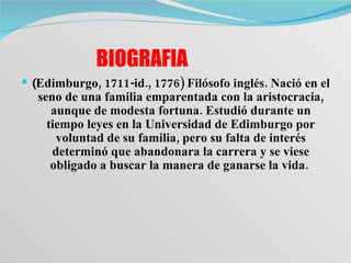 David Hume fue un filósofo escocés del siglo XVIII. Estudió leyes en la Universidad de Edimburgo pero abandonó la carrera. Publicó varios ensayos filosóficos que tuvieron éxito. Trabajó como preceptor y secretario antes de convertirse en bibliotecario en Edimburgo. Más tarde aceptó un puesto en la embajada británica en París donde se relacionó con enciclopedistas. Es conocido por su escepticismo sobre el conocimiento y la metafísica, y por desarrollar una