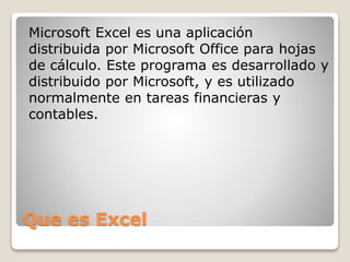 Microsoft Excel es una aplicación de hojas de cálculo desarrollada por Microsoft que se utiliza normalmente para tareas financieras y contables. En Excel, la información se organiza en una tabla con celdas, filas y columnas, donde cada celda es la intersección de una fila y una columna y puede contener datos o fórmulas.
