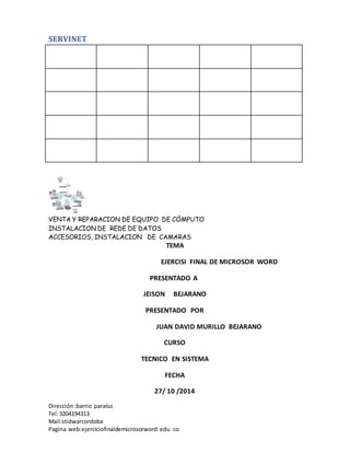 Este documento presenta la definición de Internet como una red de redes que interconecta computadoras y redes de computadoras a través de diferentes medios para compartir recursos, usando el protocolo TCP/IP. También incluye información sobre SERVINET, una empresa dedicada a la venta, reparación de equipos de cómputo e instalación de redes de datos.
