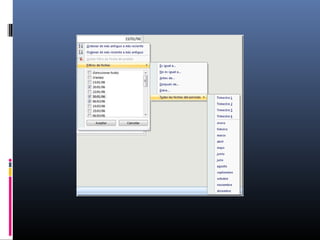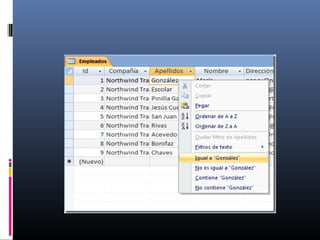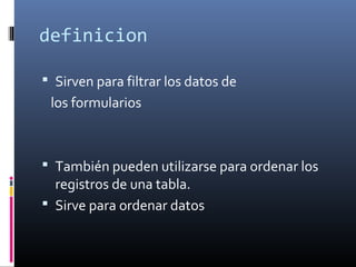 Este documento describe los filtros en Access, incluyendo que sirven para filtrar datos de formularios y ordenar registros de tablas, y cómo se pueden usar las herramientas de filtro en el Ribbon, hojas de datos y formularios emergentes para crear filtros simples y complejos de manera sencilla.