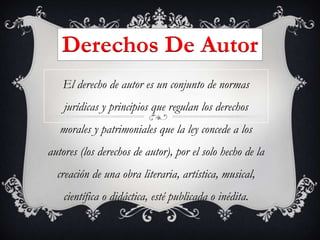 El documento trata sobre los derechos de autor. Explica que los derechos de autor son un conjunto de normas jurídicas que regulan los derechos morales y patrimoniales que la ley otorga a los autores por la creación de obras literarias, artísticas, musicales, científicas o didácticas. Además, señala que los derechos de autor buscan principalmente proteger a los creadores de obras, no solo a aquellos que lucran con ellas.