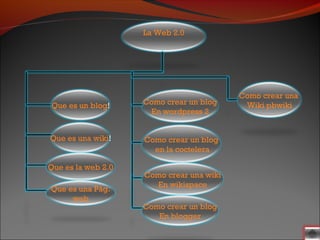 Este documento proporciona información sobre diferentes herramientas de la Web 2.0 como blogs, wikis y páginas web. Explica cómo crear blogs en WordPress, Blogger, La Cocinera y wikis en Wikispace y PBWiki. También define qué son los blogs, wikis y páginas web, y describe las características de la Web 2.0.