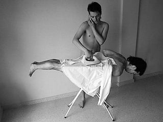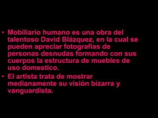 El artista David Blázquez creó la obra "Mobiliario humano" que presenta fotografías de personas desnudas formando la estructura de muebles domésticos comunes con sus cuerpos, mostrando una visión artística inusual y de vanguardia.