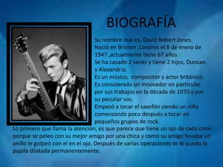 David Robert Jones, conocido artísticamente como David Bowie, nació en 1947 en Londres. A lo largo de su carrera musical innovó con diferentes estilos como el glam rock y el pop electrónico. Algunos de sus álbumes más destacados son Hunky Dory, The Rise and Fall of Ziggy Stardust and the Spiders from Mars y Let's Dance. Bowie se caracterizó por ser un artista camaleónico que cambió constantemente de imagen y sonido a lo largo de las décadas.