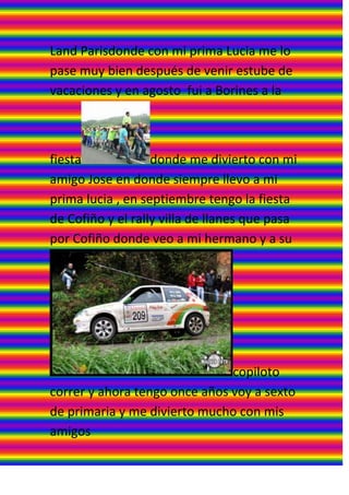 David nació en Asturias en 2002. A los 3 años empezó la escuela infantil y a los 6 años la primaria. En 2010 fue a Disneyland París de regalo después de su primera comunión. Le gusta ir a fiestas en su pueblo con su prima Lucía y ver correr a su hermano en el rally de Villa de Llanes que pasa por Cofiño. Ahora tiene 11 años y va a sexto de primaria donde se divierte con sus amigos.