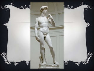 El documento describe la escultura renacentista David de Miguel Ángel, realizada entre 1501 y 1504 en mármol blanco y que mide 5,17 metros de altura. La escultura representa al bíblico David y se encuentra en la Galería de la Academia de Florencia. El documento también proporciona información sobre los antecedentes de la obra y la técnica empleada por Miguel Ángel para esculpirla desde diferentes ángulos.