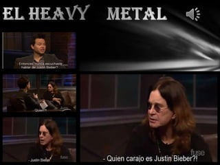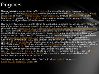 El heavy metal tiene sus orígenes a finales de los años 1960, impulsado por bandas como Deep Purple, Led Zeppelin y Black Sabbath. Black Sabbath es considerada pionera del género con su sonido pesado y letras oscuras. En los años 1970, el heavy metal ganó popularidad con bandas como estas y también con el movimiento NWOBHM en los años 1980, liderado por Iron Maiden. El género continuó evolucionando con la era del glam metal en los años 1980 en el sur de California.