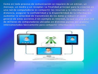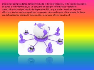 Una red de computadoras conecta equipos informáticos y software a través de dispositivos físicos que comparten datos e información. Las primeras redes de comunicación usaron tecnología telefónica y telegráfica, mientras que en la década de 1940 se transmitieron los primeros datos entre universidades; luego, en las décadas de 1960 y 1970 surgieron las minicomputadoras y los primeros ordenadores personales como el Apple I e IBM PC.