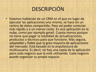 Salesforce es un CRM basado en la nube que ofrece múltiples herramientas de gestión empresarial como cuentas, contactos, correo electrónico, marketing, flujos de trabajo y análisis. Se ejecuta de forma segura y fiable en servidores externos a menor costo. Grandes empresas como Activision, Electronic Arts y NBC ya lo usan.