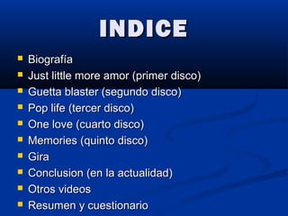 David Guetta empezó como disc jockey a los 17 años. Ha publicado 5 álbumes de estudio entre 2002 y 2010. Es conocido internacionalmente por haber realizado giras por 39 países en 2010. Actualmente está nominado a los Premios 40 Principales como mejor artista y mejor canción.