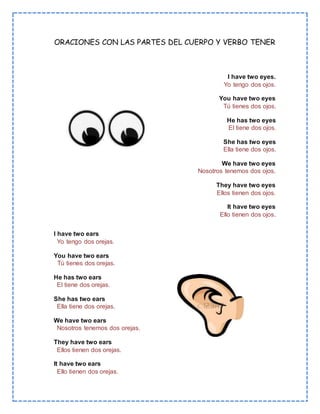 El documento presenta oraciones que describen las partes del cuerpo humano utilizando el verbo "tener" en inglés y español. En cada oración se indica qué parte del cuerpo tiene cada pronombre (yo, tú, él, ella, nosotros, ellos, ello) tanto en singular como en plural. Se enumeran las partes como ojos, orejas, manos, pies, brazos, piernas, cabeza, nariz, boca, lengua, uñas, cabello, tronco, dientes, dedos.