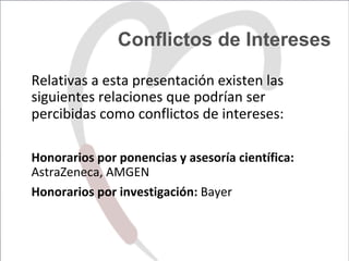 Este documento resume una presentación sobre la identificación de pacientes aptos para prolongar el tratamiento antiagregante plaquetario más allá de un año después de la colocación de un stent. Se discuten los factores de riesgo asociados con eventos isquémicos que no están relacionados con el stent, como la enfermedad polivasculares o renal. También se revisan los criterios del estudio PEGASUS para seleccionar pacientes con un balance riesgo-beneficio favorable a una prolongación del tratamiento antiagregante.
