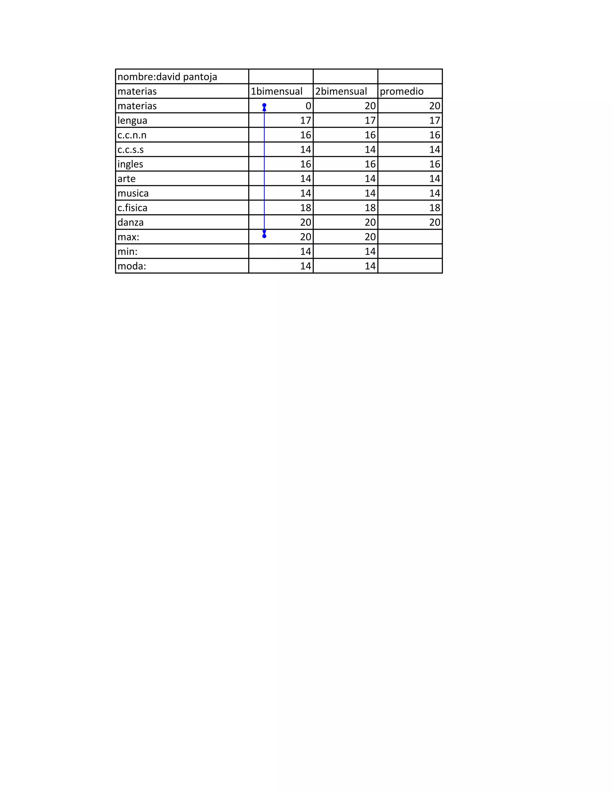 Este documento presenta las calificaciones de un estudiante en diferentes materias durante dos bimestres, incluyendo el promedio de cada materia. La mayor calificación fue de 20 en Danza, y la menor fue de 14 en varias materias como Arte, Música y C.C.S.S. La moda de las calificaciones fue 14.