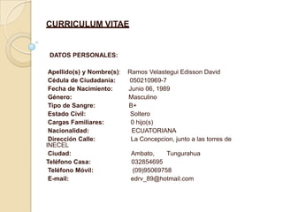 Este documento presenta el currículum vitae de David Ramos, un estudiante de ingeniería mecánica de la Universidad Técnica de Ambato. Incluye información personal como su nombre, fecha de nacimiento, dirección, y educación. David completó la secundaria en el Colegio Técnico Atahualpa y obtuvo un título de bachiller técnico en mecánica industrial. También completó estudios superiores en el Instituto Tecnológico Superior Aeronáutico donde obtuvo un título de tecnólogo en me