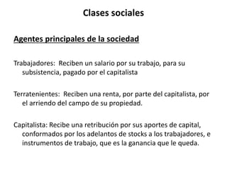 David Ricardo fue un economista inglés del siglo XIX que desarrolló teorías clave como la ley de renta diferencial y las ventajas comparativas. Argumentó que la productividad disminuye a medida que se cultivan tierras menos fértiles, lo que lleva a un estado estacionario donde la renta es igual a los salarios. Abogó por el libre comercio basado en la teoría de las ventajas comparativas, donde los países deben especializarse en lo que producen de manera más eficiente.