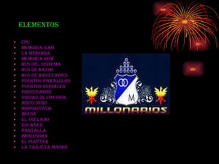 El documento lista y describe los principales componentes de un computador como la CPU, la memoria RAM y ROM, el bus del sistema, los puertos paralelos y seriales, el disco duro, el mouse, el teclado, el escáner, la pantalla e impresora. También explica que la tarjeta madre coordina y genera todas las tareas y operaciones del computador, y que los periféricos de entrada y salida son los elementos a través de los cuales se obtiene y introduce información al computador.
