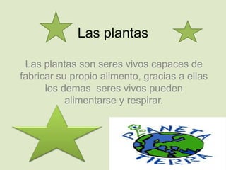Este documento describe las partes principales de las plantas, incluyendo la raíz, el tallo, las hojas, las flores y los frutos. Explica que las plantas son capaces de producir su propio alimento a través de la fotosíntesis, y que cada parte cumple una función importante como transportar nutrientes, darle estructura a la planta, producir semillas o absorber agua y luz solar.