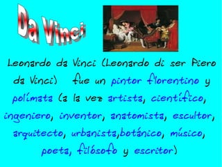 Leonardo da Vinci fue un polímata del Renacimiento italiano conocido principalmente por sus pinturas como La Última Cena, La Dama del Armiño y la Mona Lisa. Nació en 1452 en Italia y murió en 1519 a los 67 años. Fue pintor, científico, ingeniero, inventor, anatomista, escultor, arquitecto, urbanista, botánico, músico, poeta y filósofo. Pintó La Virgen de las Rocas dos veces para museos en París y Londres.